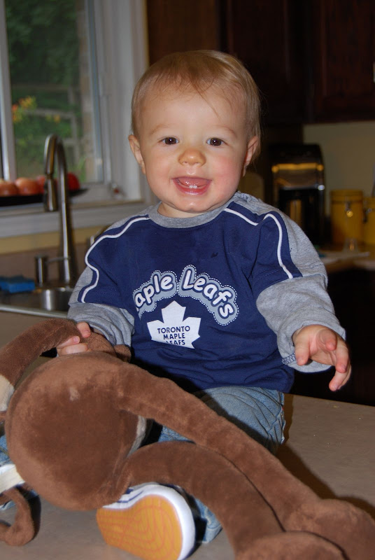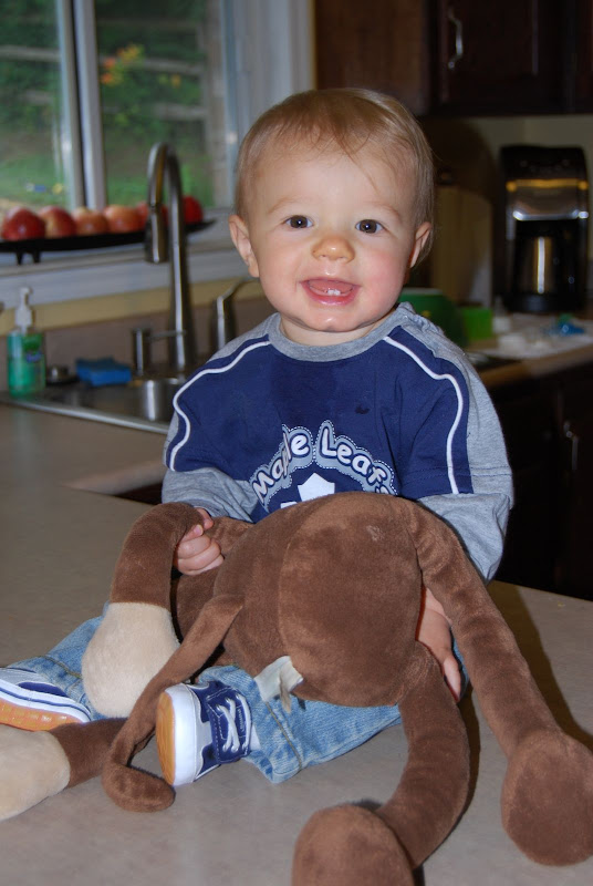 Jack has officially declared his security item. We bought him a stuffed monkey months ago and it has been in his crib ever since. Recently, he holds 'Bubba' (as he seems to call him) with a death grip as we get him out of bed. He likes to carry (or drag, really) Bubba around and sometimes will not let go without a sob. The other day we caught a few cute pictures of Jack and his monkey....